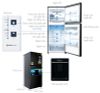 Chiếc tủ lạnh Inverter với dạng ngăn đá trên, thiết kế vuông vắn, nhỏ gọn và màu thép đen ánh kim mới lạ, dễ dàng kết hợp với nội thất trong nhà.